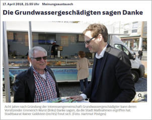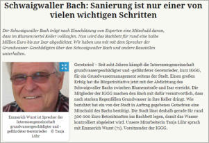 Emmerich Wurst, 1. Vorsitzender IGGG bedankte sich am Grünen Markt für das Engagement der Stadt Geretsried bei den Bürgermeistern. Die Bewohner des Blumenviertels sind dem Bürgermeister..n sehr dankbar", sagte Emmerich Wurst.> Einer von vielen wichtigen SchrittenMünchner Merkur Online vom 19.04.2018Der Schwaigwaller Bach trägt nach Einschätzung von Experten eine Mitschuld daran, dass im Blumenviertel Keller volllaufen. Nun wird das Bachbett für rund eine halbe Million Euro bis zur Isar abgedichtet. Interview des Münchner Merkur mit dem IGGG 1. Vorsitzenden Emmerich Wurst über den Schwaigwaller Bach und andere Baustellen.