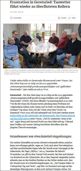 April 2023Der Messpegel GER 211 ist seit April 2023 störanfällig, funktioniert nicht. Die Stadtverwaltung wurde kontaktiert.Dezember 2023Am 1. und 2. Dezember 2023 ereignete sich in Süddeutschland ein Wintereinbruch mit starkem Schneefall, der insbesondere auch in Geretsried den Verkehr massiv einschränkte. Starkwind und tagelanger Regen sorgten auch für einen Anstieg des Pegels. 12. Dezember 2023Rekorkniveauhöhe des Pegels am 13.12.2023 bei 588,66 = -1,88m. und es trifft wieder mal das Blumenviertel. In vielen Keller drang Wasser ein. Die Pumpen müssen nächtelang arbeiten. Alarmstufe rot!Warnmeldung betreffend jahreszeitlich ungewöhnlichen Anstiegs des Grundwassers im Bereich Blumenviertel. Januar 2024Nach einigen Jahren Ruhe sind zum Jahreswechsel erneut viele Häuser im Stadtteil Gartenberg mit Wasser vollgelaufen. Betroffene fordern von der Stadt nun ein umfassendes Grundwassermanagement, das auch Oberflächenwasser einbezieht.Süddeutsche Zeitung vom 17.1.2024Frustration in Geretsried: Tauwetter führt wieder zu überfluteten KellernMünchner Merkur vom 22.1.2024