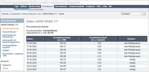 Januar 2024Nach einigen Jahren Ruhe sind zum Jahreswechsel erneut viele Häuser im Stadtteil Gartenberg mit Wasser vollgelaufen. Betroffene fordern von der Stadt nun ein umfassendes Grundwassermanagement, das auch Oberflächenwasser einbezieht.Süddeutsche Zeitung vom 17.1.2024Frustration in Geretsried: Tauwetter führt wieder zu überfluteten KellernMünchner Merkur vom 22.1.2024Mai 2024Der Messpegel GER 211 ist störanfällig und hat seit 20.5.2024 keine Messdaten in der Anzeige. Die Stadtverwaltung wurde kontaktiert. Wir fragen nach warum, denn das ist nicht das erste Mal.Juni 2024Seit 30.5.2024 regnet es rund um die Uhr. Überflutungen und steigende Pegel in ganz Bayern siind die Folge. Katastropenarlarm und Evakuierungen unter dramatisch Umständen sind die Folge.Wir können keine Daten vom Pegel Ger211 auslesen da dieser gerade jetzt nicht funktioniert.Pegelanstieg in wenigen Tagen von über 70 cm beim Pegel Feuerwehschule und Pegel 177 Geretsried-Stein um 1,09 m.Warnmeldung betreffend jahreszeitlich ungewöhnlichen Anstiegs des Grundwassers im Bereich Blumenviertel.