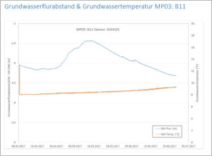 Grundwassserpegel Karl-Lederer-PlatzDaten zu den Grundwasserpegeln:Datensammler: Firma DHI WASY GmbHAktiv seit: 04.2017Orte: Lenauweg, Hermann-Löns-Weg, B11, GraslitzerstraßeGeländeoberkante: verschieden ü. NNGrundwassermessdatenIm Rahmen des Grundwasser-Beweissicherungs-programms der Stadt Geretsried, möchte ich Ihnen zur allgemeinen Information die aktuellen Grundwasser-messdaten zusenden. Aktuell (Stand 28.6.2017) sind die Grundwasserstände aufgrund der geringen Niederschläge sehr niedrig.Dr.-Ing. Patrick Keilholz, Büroleiter München, Senior Consultant, DHI WASY GmbHGrundwasserständeZeitraumMonate _______________________________________________________________________________________April - Juni 2017Juli 2017 - Dezember 2017 noch ausstehendJanuar 2018 - Juni 2018 noch ausstehend
