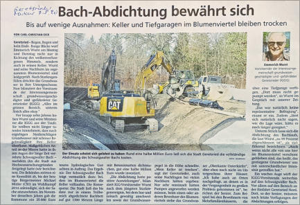 > Bachabdichtung bewährt sich“Die Investition der Stadt in die Ab-dichtung des Schwaigwaller Bachs scheint sich bewährt zu haben. Trotz des starken Regens zu Beginn der Woche blieben die meisten Keller und Tief-garagen im Blumenviertel trocken”.Interview des Münchner Merkurs mit IGGG Vorsitzender Emmerich Wurst.Münchner Merkur vom 07.08.2020