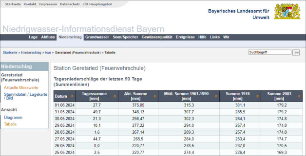 Januar 2024Nach einigen Jahren Ruhe sind zum Jahreswechsel erneut viele Häuser im Stadtteil Gartenberg mit Wasser vollgelaufen. Betroffene fordern von der Stadt nun ein umfassendes Grundwassermanagement, das auch Oberflächenwasser einbezieht.Süddeutsche Zeitung vom 17.1.2024Frustration in Geretsried: Tauwetter führt wieder zu überfluteten KellernMünchner Merkur vom 22.1.2024Mai 2024Der Messpegel GER 211 ist störanfällig und hat seit 20.5.2024 keine Messdaten in der Anzeige. Die Stadtverwaltung wurde kontaktiert. Wir fragen nach warum, denn das ist nicht das erste Mal.Juni 2024Seit 30.5.2024 regnet es rund um die Uhr. Überflutungen und steigende Pegel in ganz Bayern siind die Folge. Katastropenarlarm und Evakuierungen unter dramatisch Umständen sind die Folge.Wir können keine Daten vom Pegel Ger211 auslesen da dieser gerade jetzt nicht funktioniert.Pegelanstieg in wenigen Tagen von über 70 cm beim Pegel Feuerwehschule und Pegel 177 Geretsried-Stein um 1,09 m.Warnmeldung betreffend jahreszeitlich ungewöhnlichen Anstiegs des Grundwassers im Bereich Blumenviertel.