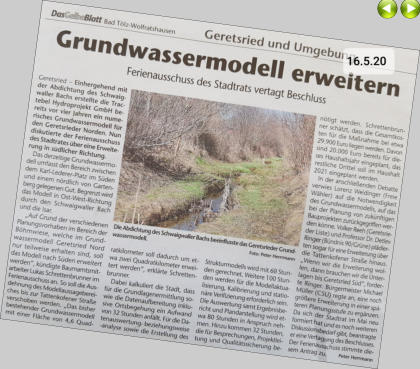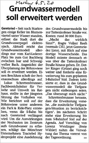 > Bachabdichtung bewährt sich“Die Investition der Stadt in die Ab-dichtung des Schwaigwaller Bachs scheint sich bewährt zu haben. Trotz des starken Regens zu Beginn der Woche blieben die meisten Keller und Tief-garagen im Blumenviertel trocken”.Interview des Münchner Merkurs mit IGGG Vorsitzender Emmerich Wurst.Münchner Merkur vom 07.08.2020